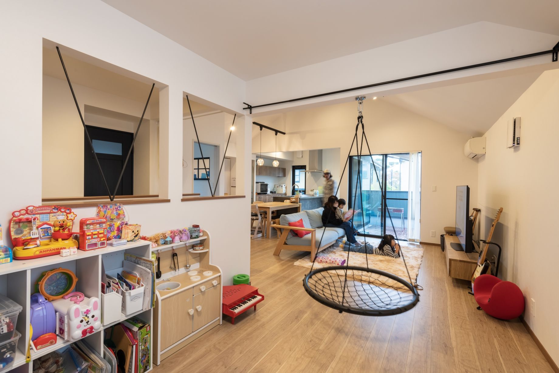 音楽室を地下に造ることで、防音にも優れ、他の階の部屋も広くとれました。また、LDKを大空間にするために壁を取り払い、筋交いという構造をあえて見せてデザイン的にも工夫を詰めました!