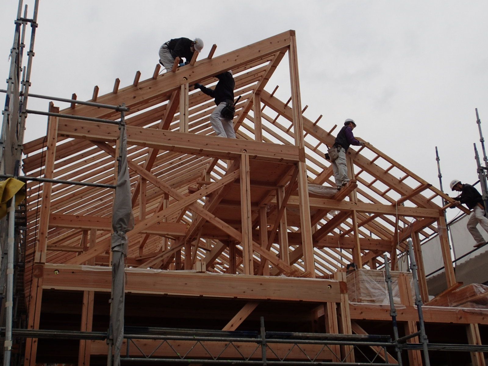 柱や梁などを組み立てて、屋根の一番上の部材である棟木を取り付けます。全工事過程の中で、もっとも劇的に変化があり家づくりを実感できる1日です。 ぜひ、時間の許す限りゆっくりと現場でお越しください。