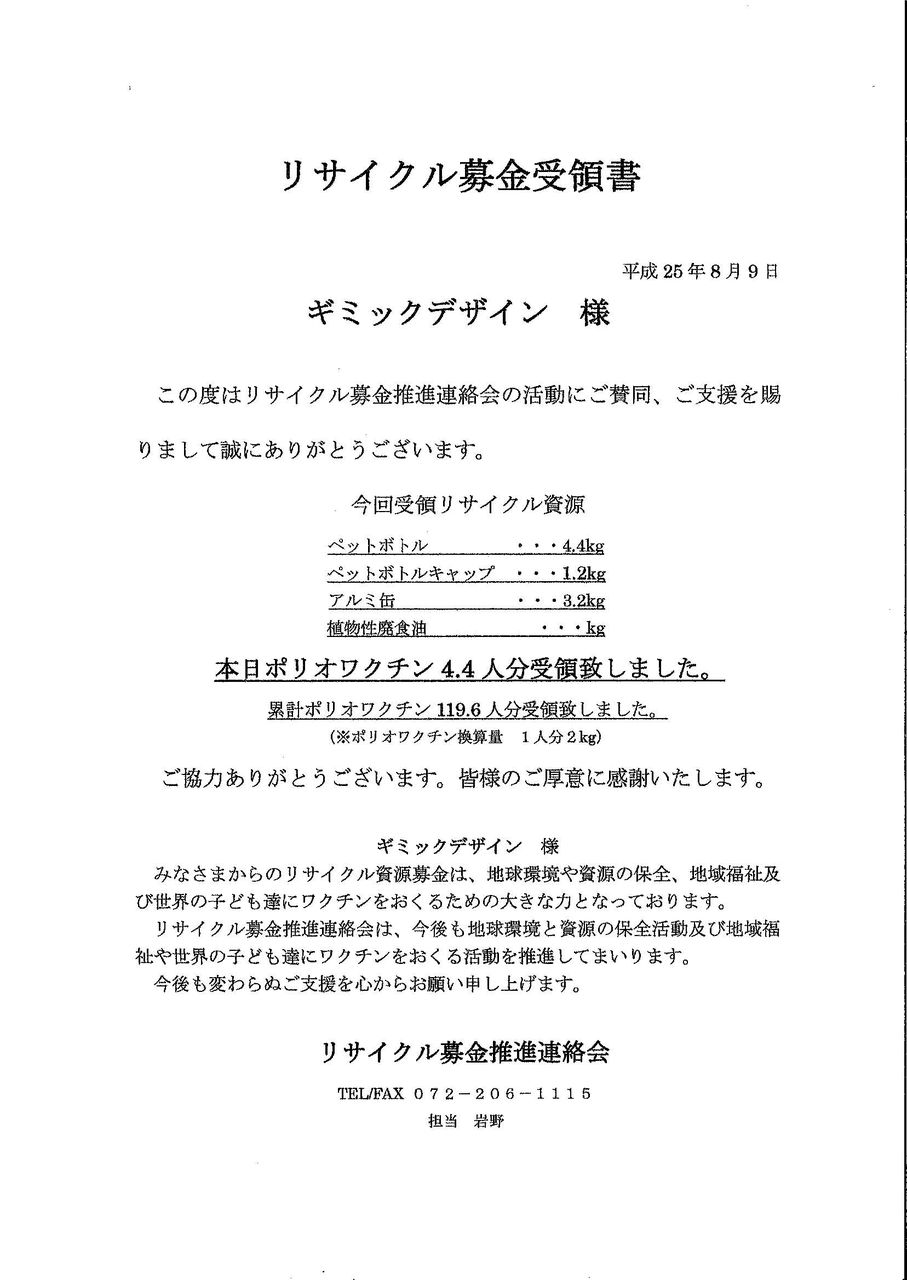 2013年 8月 9日 ペットボトル4.4kg・ペットボトルキャップ1.2kg・アルミ缶3.2kg