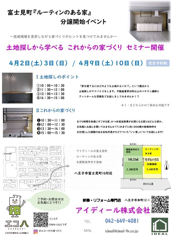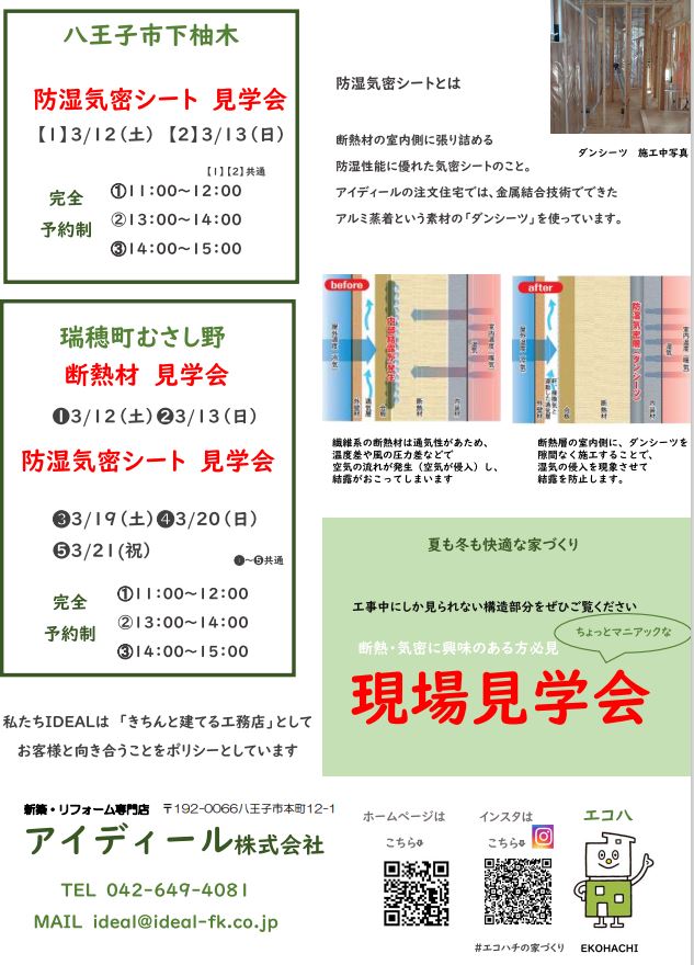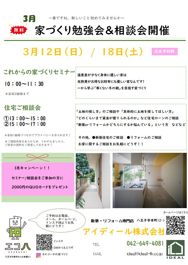 八王子市下柚木 3/12(土) 3/13(日)瑞穂町むさし野 3/19(土)3/20(日)3/21(祝)10:00~15:00「完全予約制」