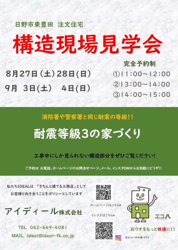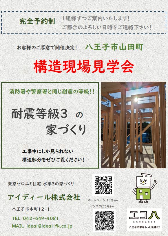 完成してからでは見られない、 耐震等級3の構造体をご見学できます!