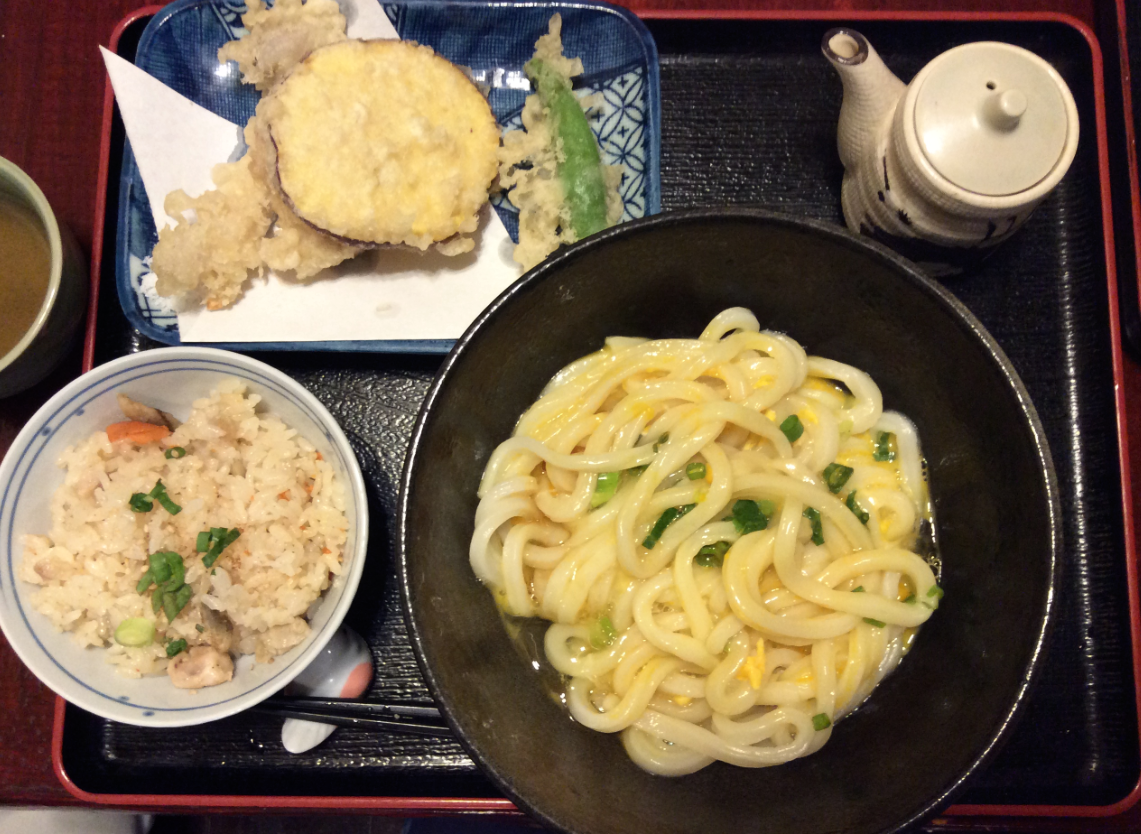 お昼のセット(選べるうどん(かまたまを選びました!)とかやくご飯、写真には映ってないですが小鉢つき)¥800に