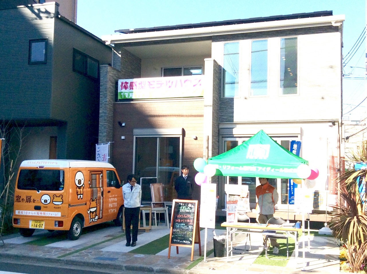 1DAYリフォーム=パッとリフォーム=パッと とりかえる でトリとカエルをモチーフにしたラッピングカーです。かわいいですよね。