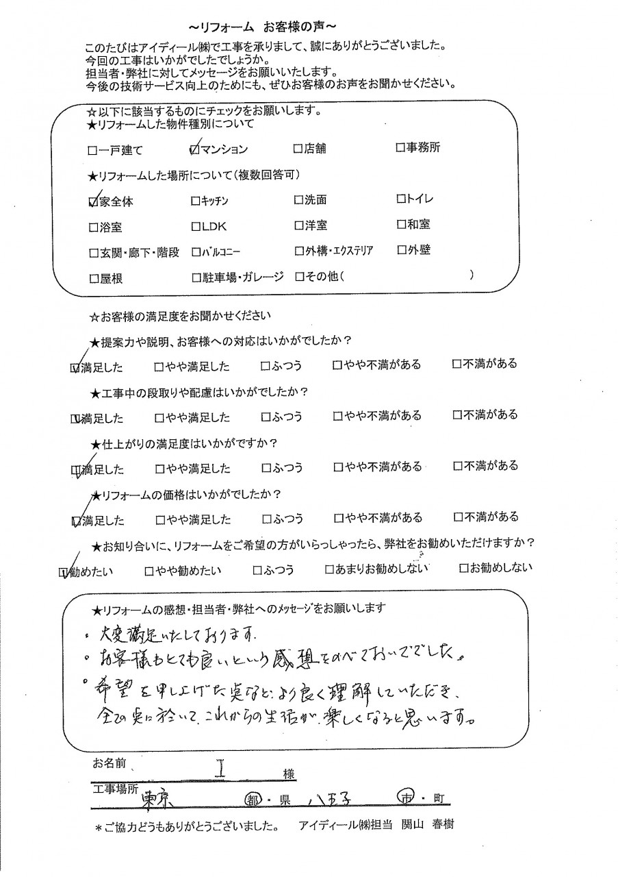西八王子 I様よりマンションの全面リフォーム改修後 お客様の声アンケート頂きました