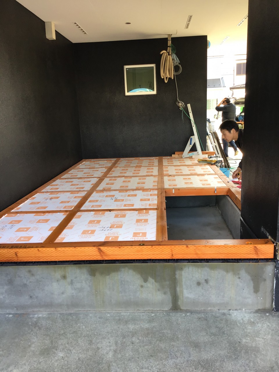 最初は基礎だけの状態でしたが、基礎の上に基礎パッキンを敷き込みます。