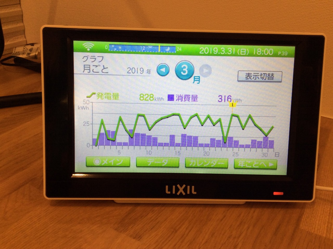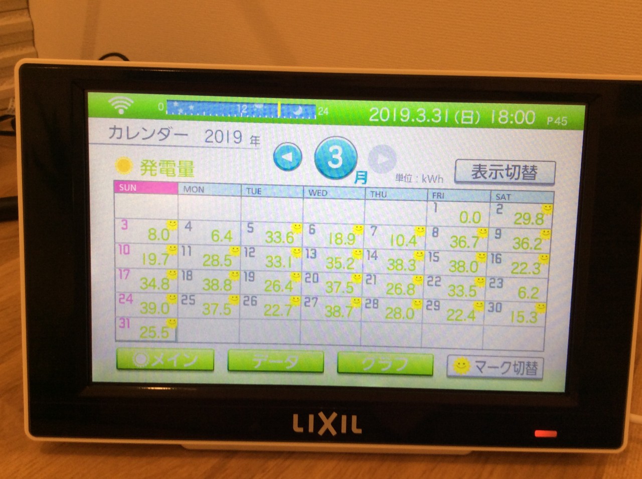 上の写真は3月の各日の発電量がわかるカレンダーです。