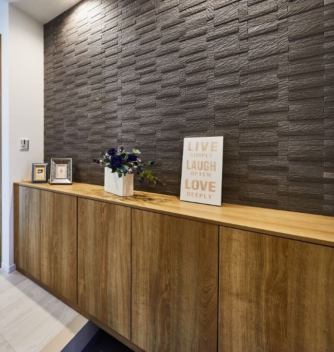 エコカラットプラスになったことで、清掃性がプラス!調湿する壁なのに、なんと水拭きができるようになったのです。これまではエコカラットとエコカラットプラスの2種類があり、水廻りにつかえる商品はエコカラットプラスの限られた商品だけだったのですが、全タイプがプラスになったことで、選べるバリエーションが増えました。