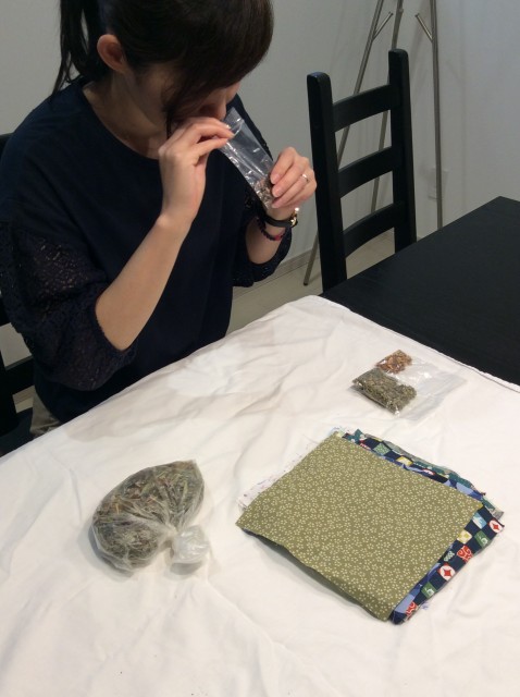 あらかじめ選んだ布に、ハーブを置いてみると大体このくらいの分量が