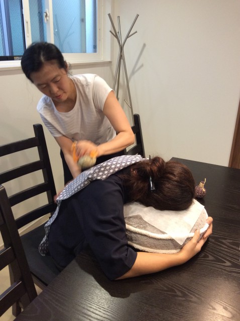 アイディールのまるっと女子(笑)佐藤も施術体験。温めたハーブボールはとても気持ちいいです