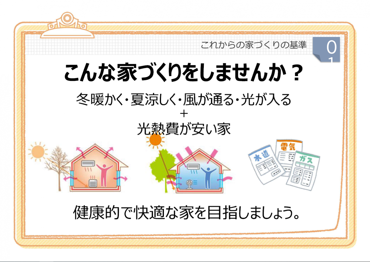 最小限のエネルギー(光熱費)で、「冬暖かい」「夏涼しい」「風が通る」「明るい」が実現するということです。