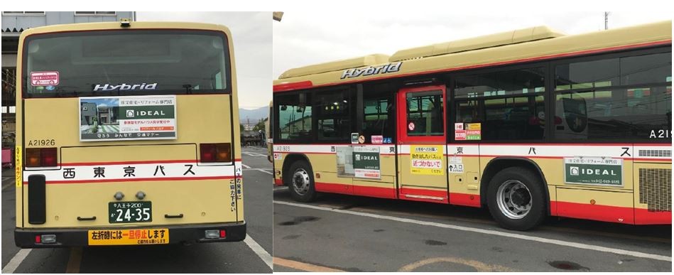 さて、アイディールでは八王子市内を走る西東京バスに看板を出しております。八王子にお住まいの方はご覧になられたことはありますでしょうか?この度3度目のデザイン変更を経て、写真のデザインのものが市内を走っております。今回はモデルハウスと事務所が映った写真、そう!ホームページのトップ写真と同じです。アイディールの顔、となってくれるであろう写真をメインでつかっています。