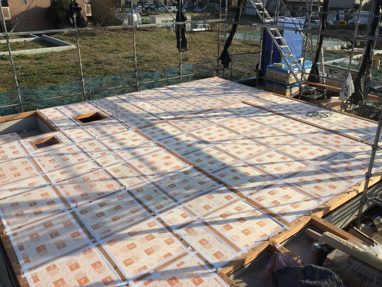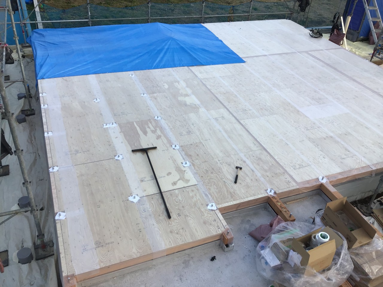 その上にフローリングの下地となる床板まで施工します。