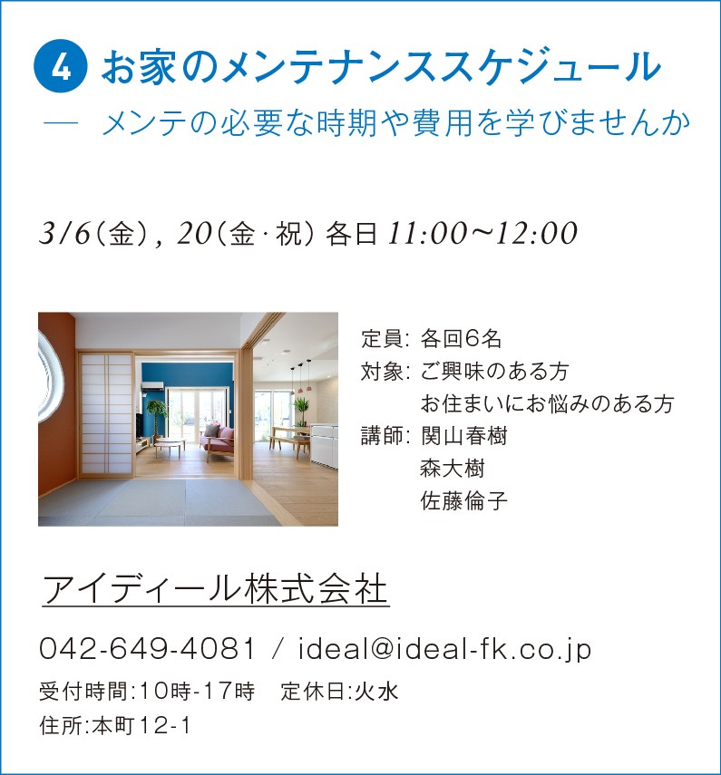 さてさて、3月に行われます八王子まちゼミに、前回に引き続きアイディールも参加致します!前回は新築住宅をお考えの方向けの内容でしたが、今回は幅広い方にお話ができたらと思いまして、「お家のメンテナンススケジュール」という講座名にて、メンテナンスをすべきタイミングや費用などをお伝えできればと思っております。