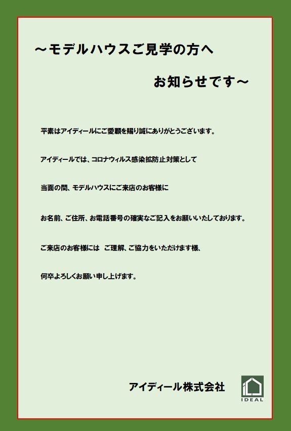 また、モデルハウスにお越し下さる方へのお願いでございます。モデルハウスの前にも掲示させていただいておりますが、こちらも感染拡大対策として、不特定多数のご来場をご遠慮させていただいておりますので、通常時にもいただいておりますアンケート用紙ではございますが、お名前、ご住所、お電話番号の確実なご記入をお願い申し上げます。みなさまのご理解ご協力、何卒よろしくお願い申し上げます。