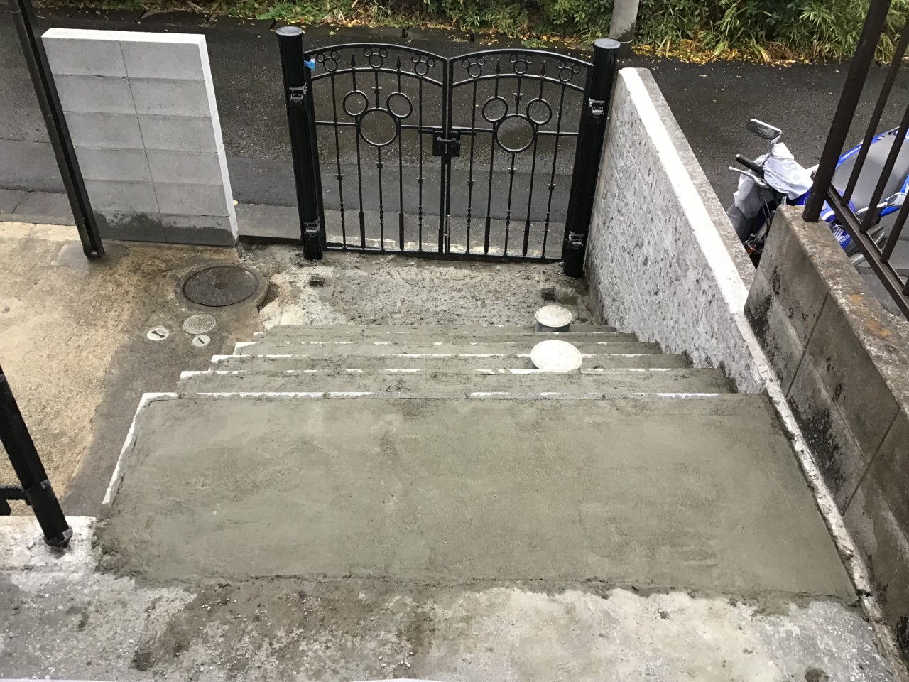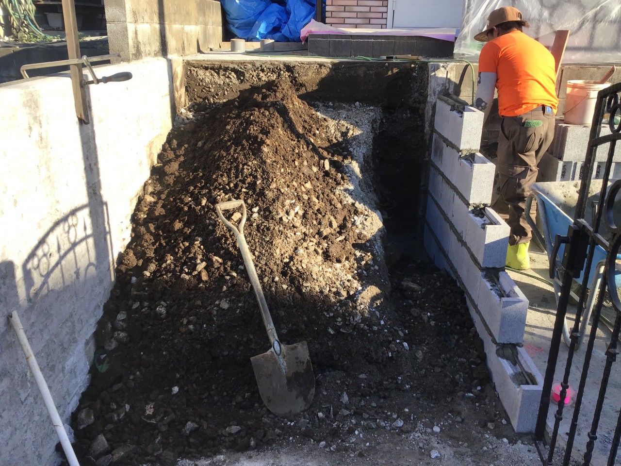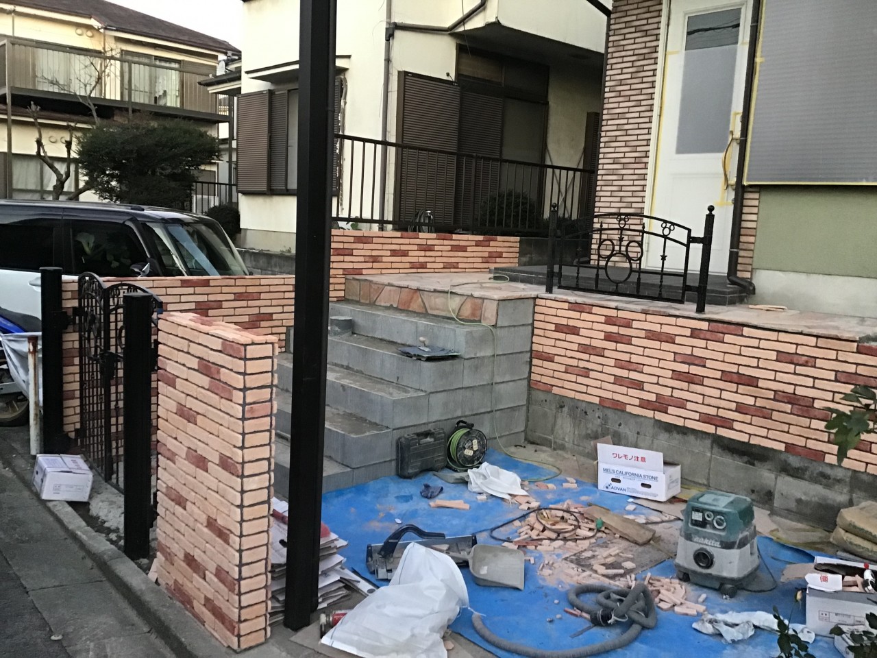 その後、階段を造作するための下地作りと洋風なデザインにするためブロック塀の新設。
