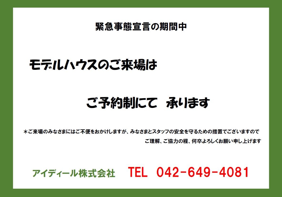 続きましては、・・・なお話しです。昨今の不安な情勢、各方面での自粛などを鑑みまして、アイディールのモデルハウスも緊急事態宣言中は完全予約制にて承ることといたしました。スタッフの健康、安全と何よりお客様の健康、安全のための措置でございます。ご不便をおかけいたしますが、ご理解ご協力どうぞよろしくお願い申し上げます。