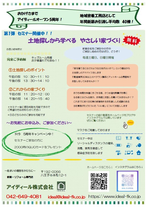 コロナウィルスの感染拡大対策ということもあり、完全予約制とさせていただきますが、地域密着工務店のアットホームな雰囲気での無料のセミナーになりますので、ぜひお気軽にご参加いただければと思います。