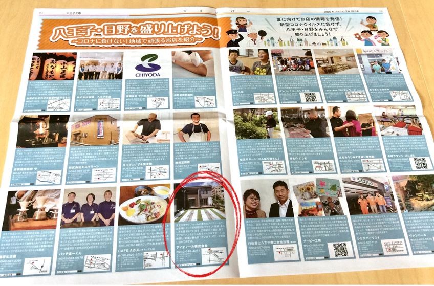 こんにちは、佐藤です。ここ数日の各地での大雨、とても心配です。また東京都でのコロナウィルスの感染者数が大幅に増え、こちらも心配ですね。コロナウィルスが完全になくなるまでには、まだ時間がかかるでしょうから、気をつけながらwithコロナで上手に共存していかなければなりませんね。そんな中、地域新聞のショッパーの今週号は「コロナに負けるな!元気を取り戻そう。」という企画で八王子・日野応援特集となっていまして、アイディールが掲載をされております。今回の掲載は見開きページのお店の紹介ページの他に、各お店の経営者さんやスタッフさんが八王子、日野へのメッセージボードを掲げて映っている写真が表紙の1面記事となっております。この1面記事写真とお店紹介ページはショッパーの配布エリアによっていくつかパターンがあるのですが、八王子北エリアと八王子西、高尾エリアバージョンの1面には、我らが常務、アイディールの小野が登場しております!!