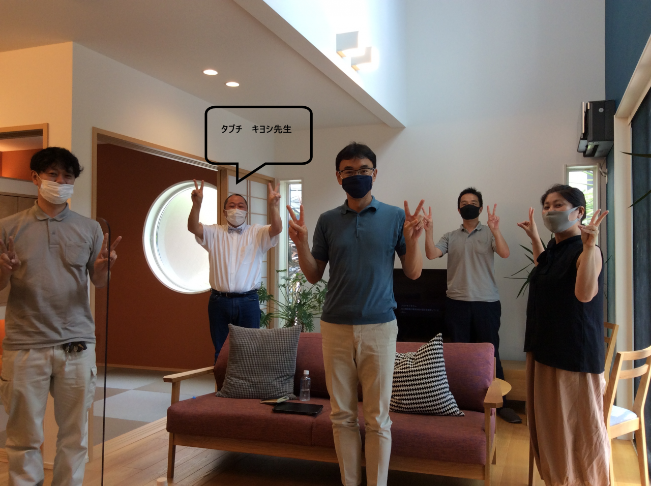 実際にお話しをお伺いしても、聞いている相手をワクワクさせてくれる内容で、アイディールの相談にも親切にお答えくださいました。お話は面白いだけでなくとても熱心に真剣にしていただき、また少し見せていただいた間取りは、とても斬新でテンションがあがってしましました。おかげさまで暑い一日がとても熱い一日となりました。タブチ先生が教えてくださったことを、アイディールでも上手にとりいれて、結果みなさまにおつたえできるように活かしていければと思っています。下の写真は、写真をお願いししたら「みんなで同じポーズをしましょう!」と言ってくださったので、みんなでお揃いポーズです。先生をはじめ、機会をあたえてくださったパナソニックさん、どうもありがとうございました!