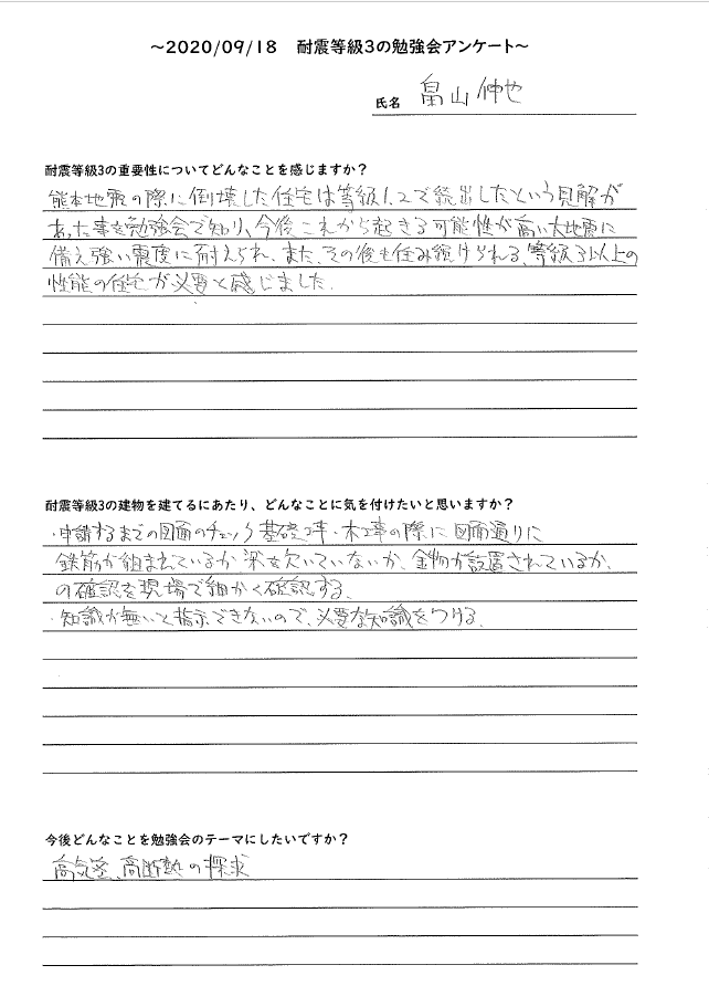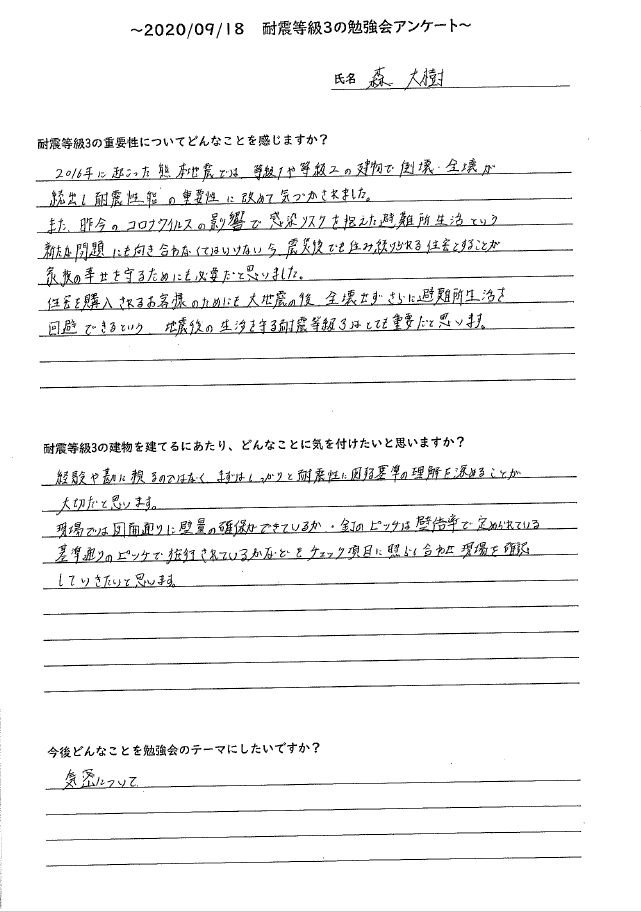 勉強会では、熊本地震の被災状況、建築基準法の耐震性、耐震等級3と等級1の住宅の比較、耐震等級3の重要性などを勉強しました。