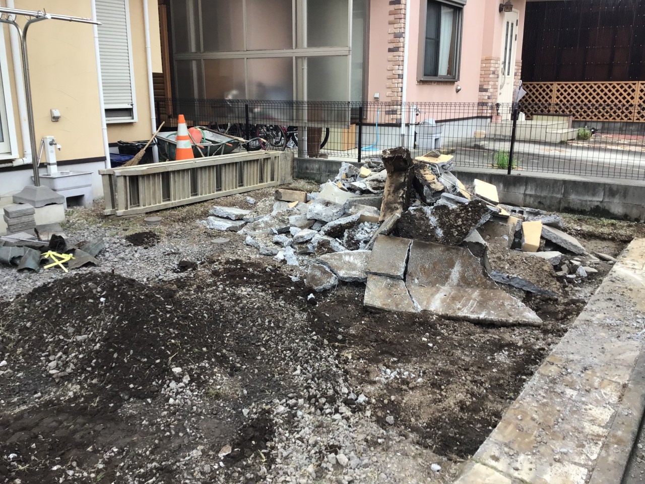 まずは、既存の土間コンクリート・乱形石と門袖を解体!