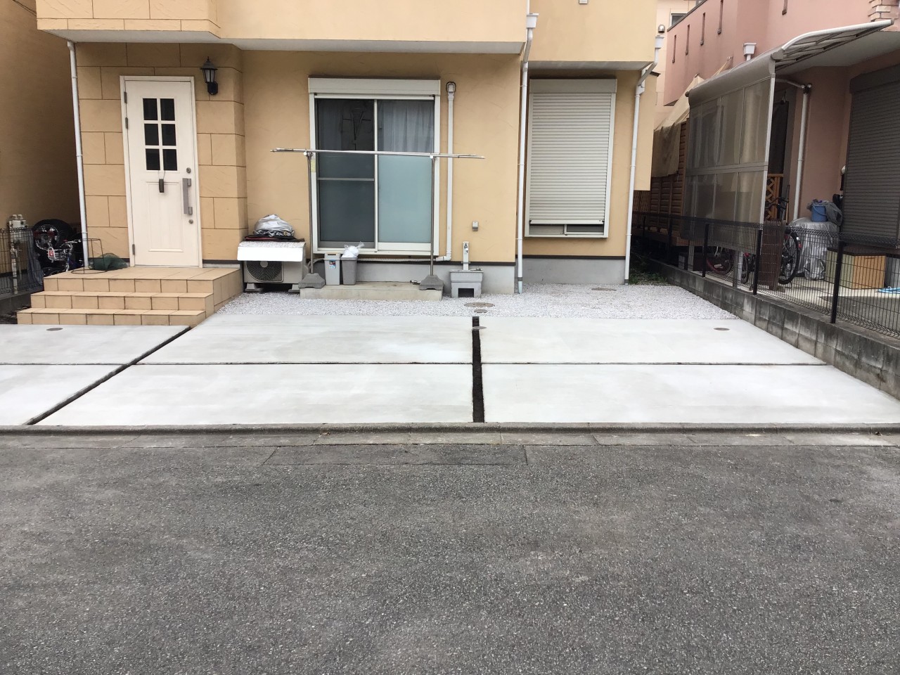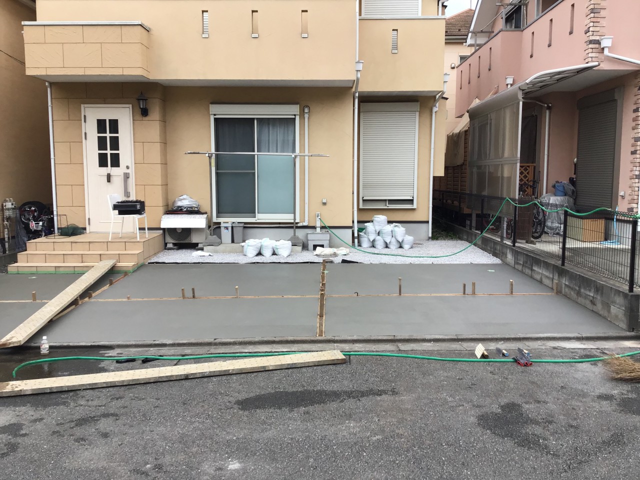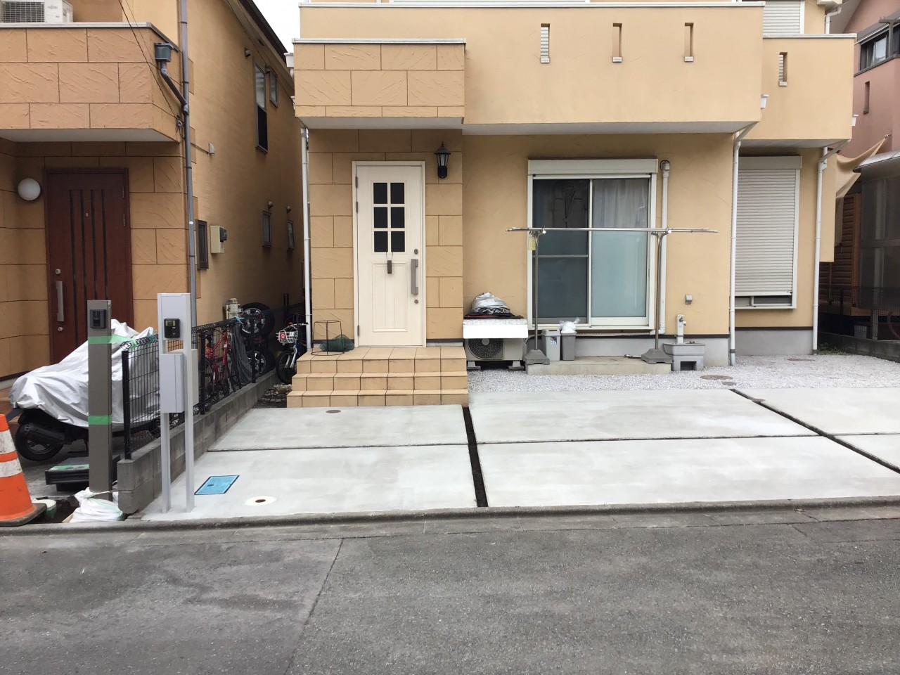 お施主様のご要望は、雑草の手入れが面倒だからお庭をコンクリート打ちにしたいということと既存の門袖を解体しアプローチ部分を広くしたいということでした。