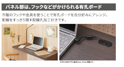 パーテーションのパネルは有孔ボードになっていますので、フックや金具を使う事でアレンジする事が可能です!