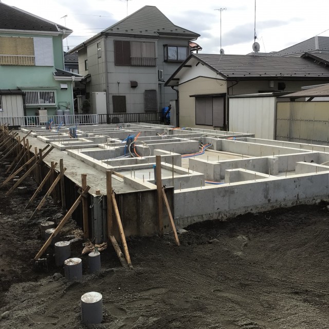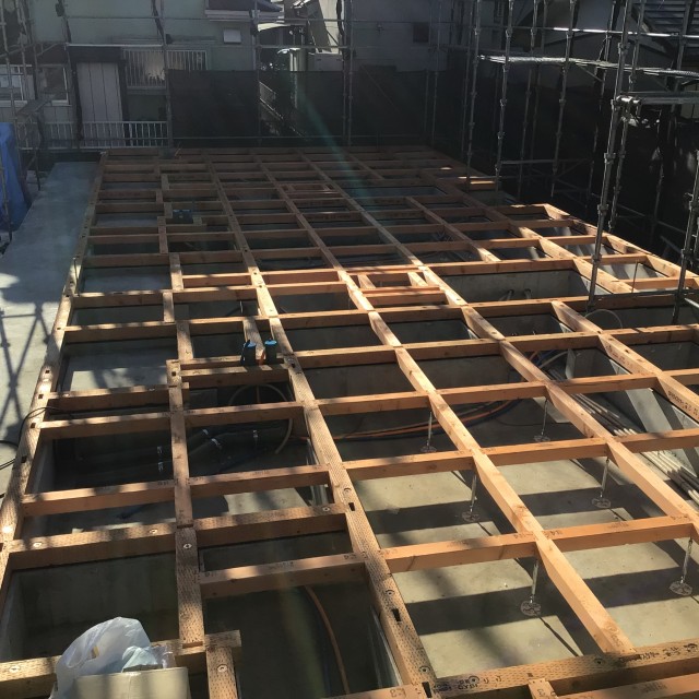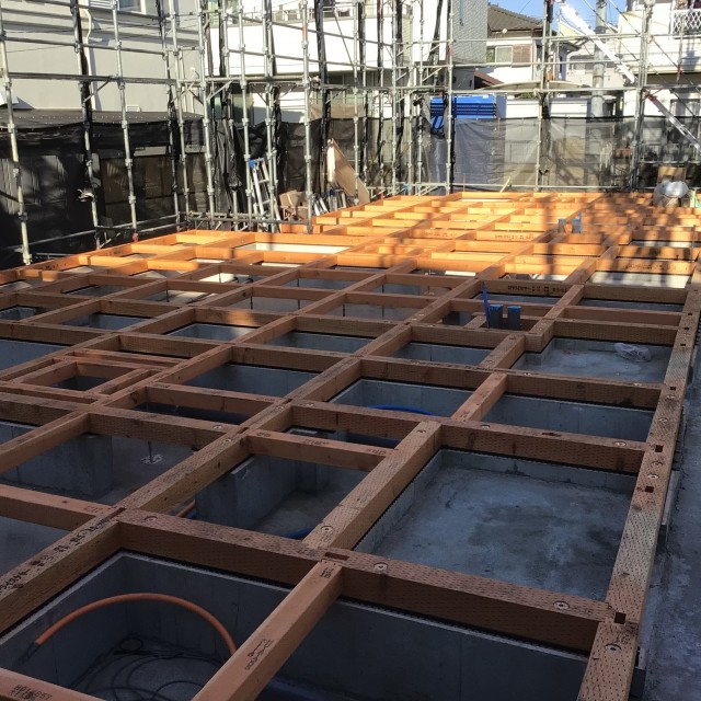 大工さんが入り、基礎の上に木材を敷きこむ、土台敷きがおおよそ完了している状態です。