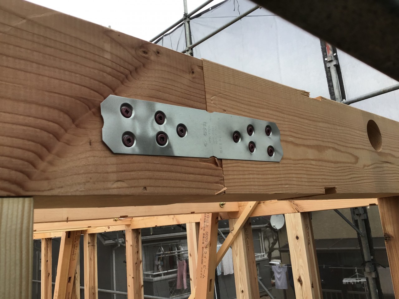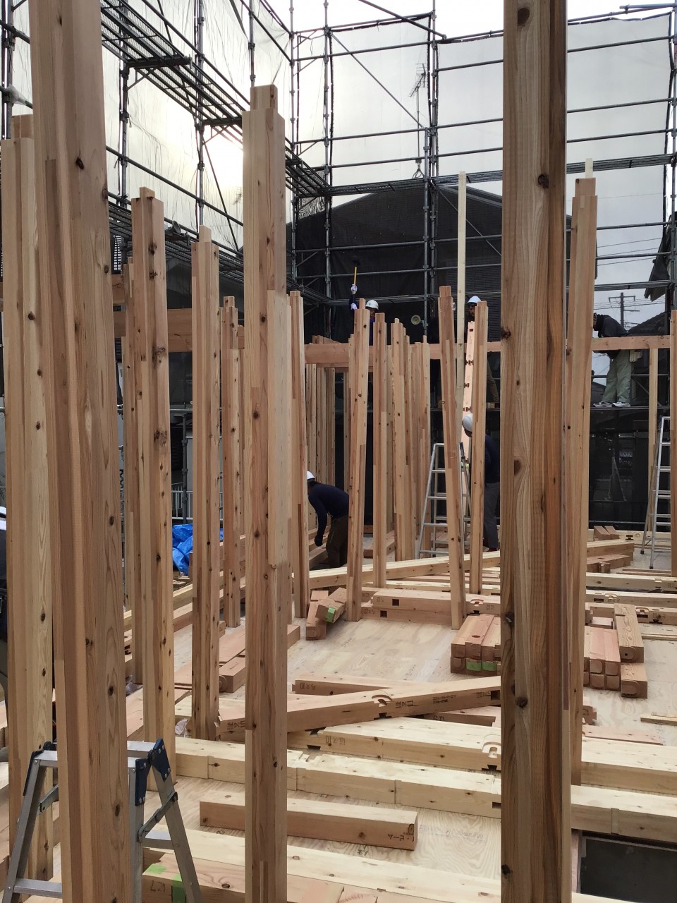ちょっと工程が早送りになってしまいましたが、2階の柱と小屋梁を掛けて、