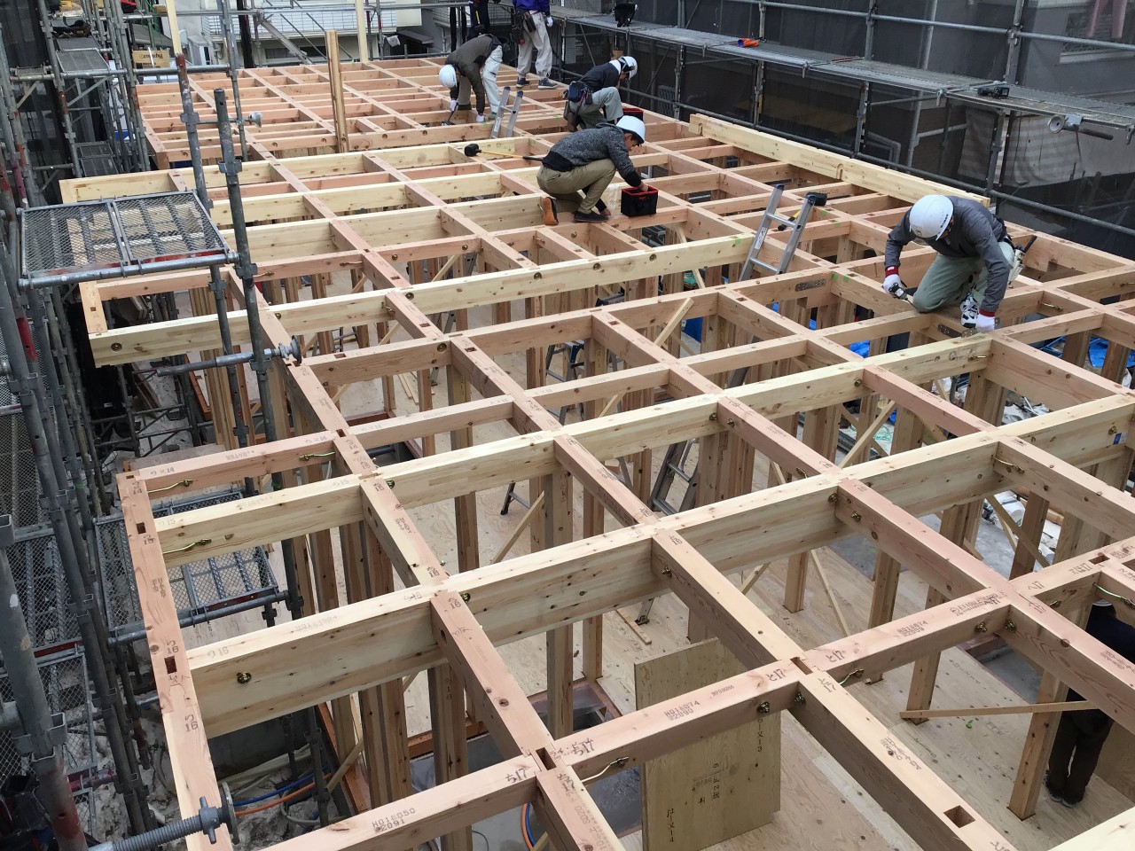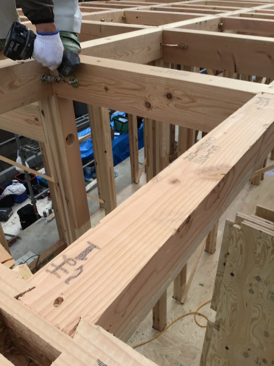 手際よく作業が進行し、1階の梁まで施工が完了しました。