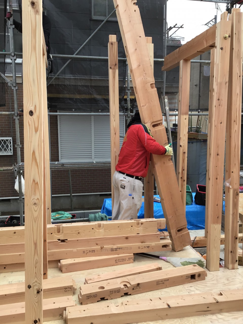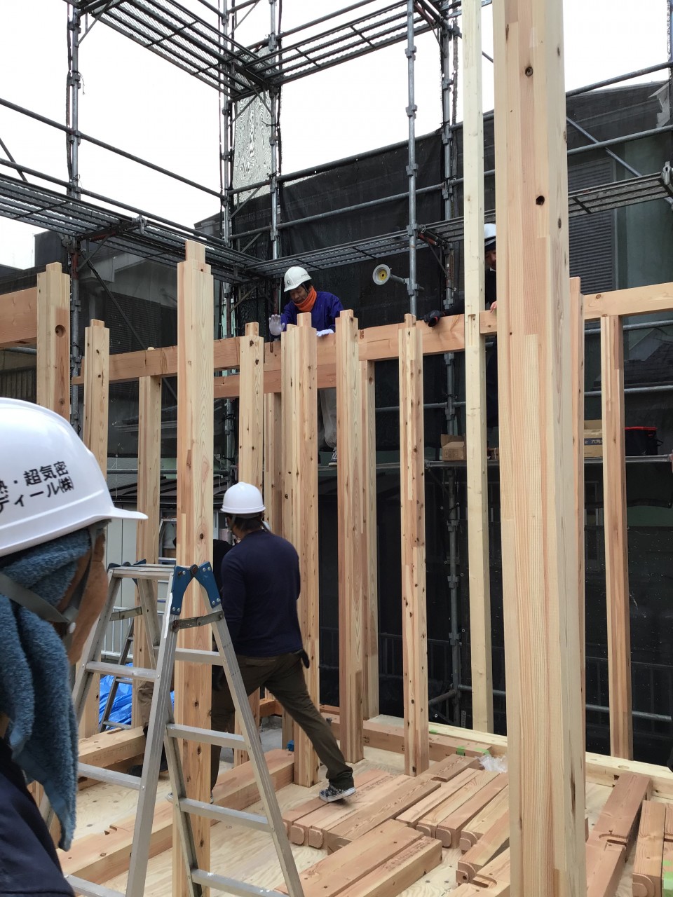 当日は担当の大工さん2名と応援の大工さん4名と建て方2名と荷揚げの方5名の合計13名で作業をしました。