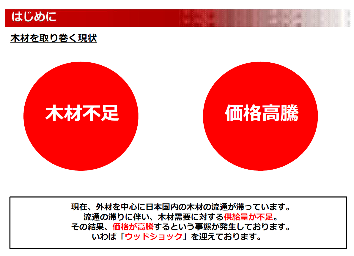 すでに報道などでご存じかと思いますが、アメリカの住宅供給の増加、輸入するためのコンテナ不足、コロナ禍という要素が重なり、日本への構造材の供給不足となっている様です。