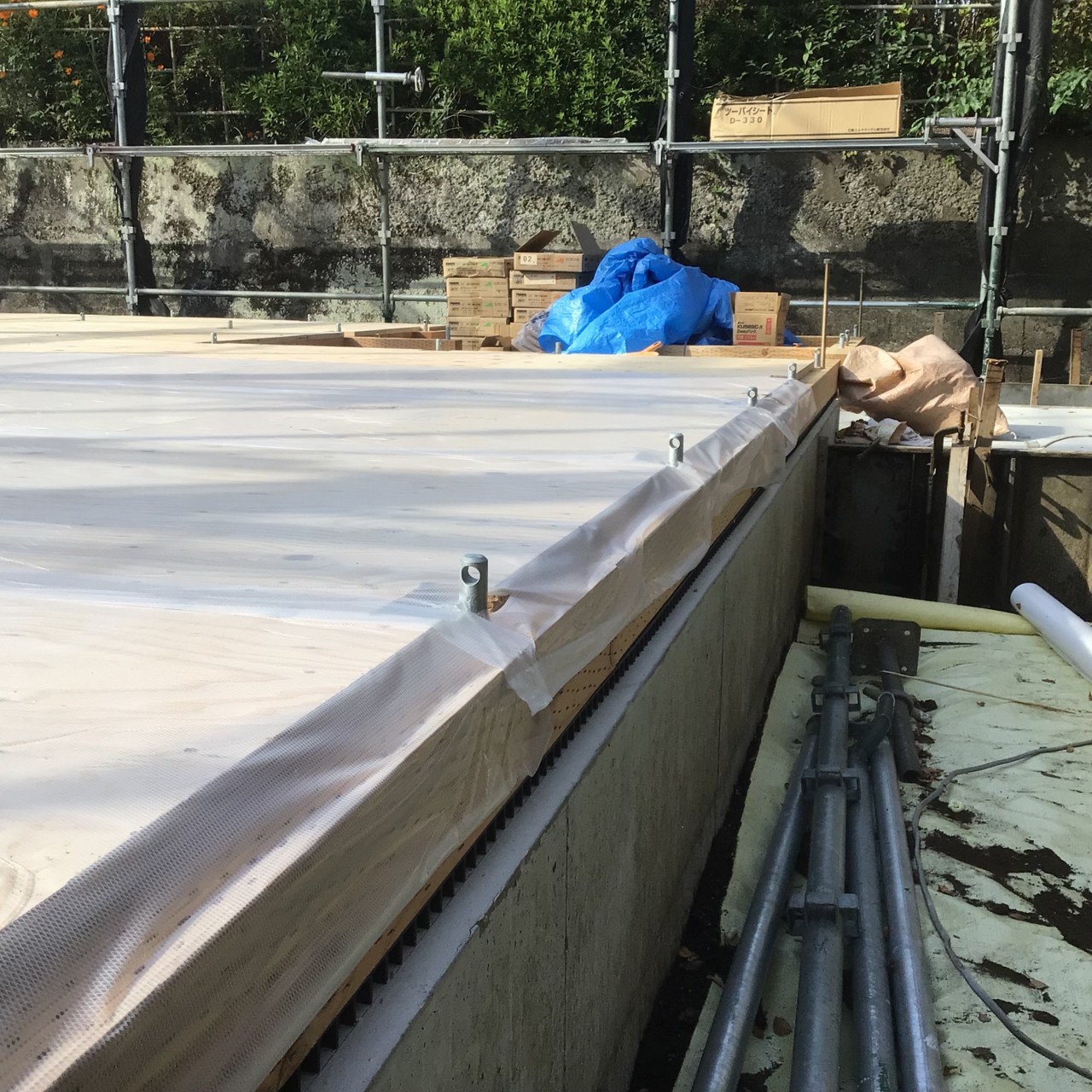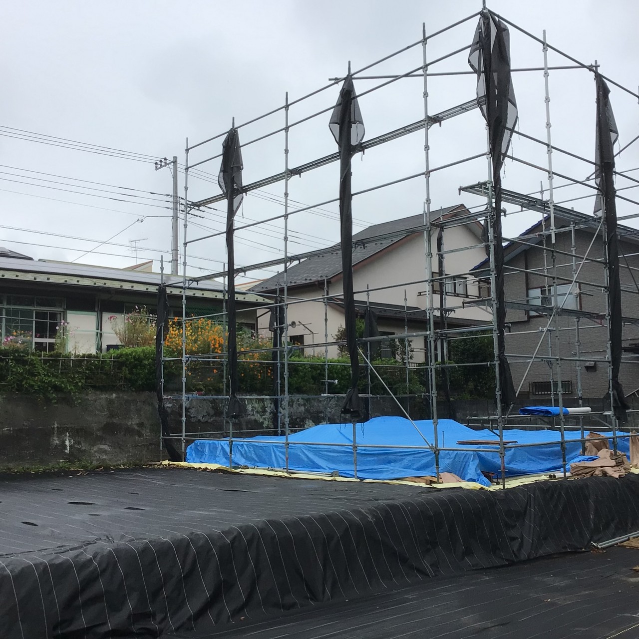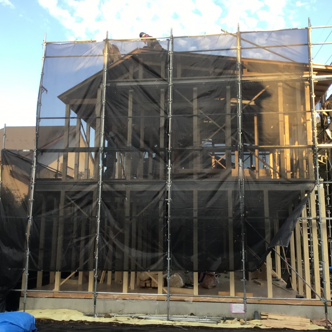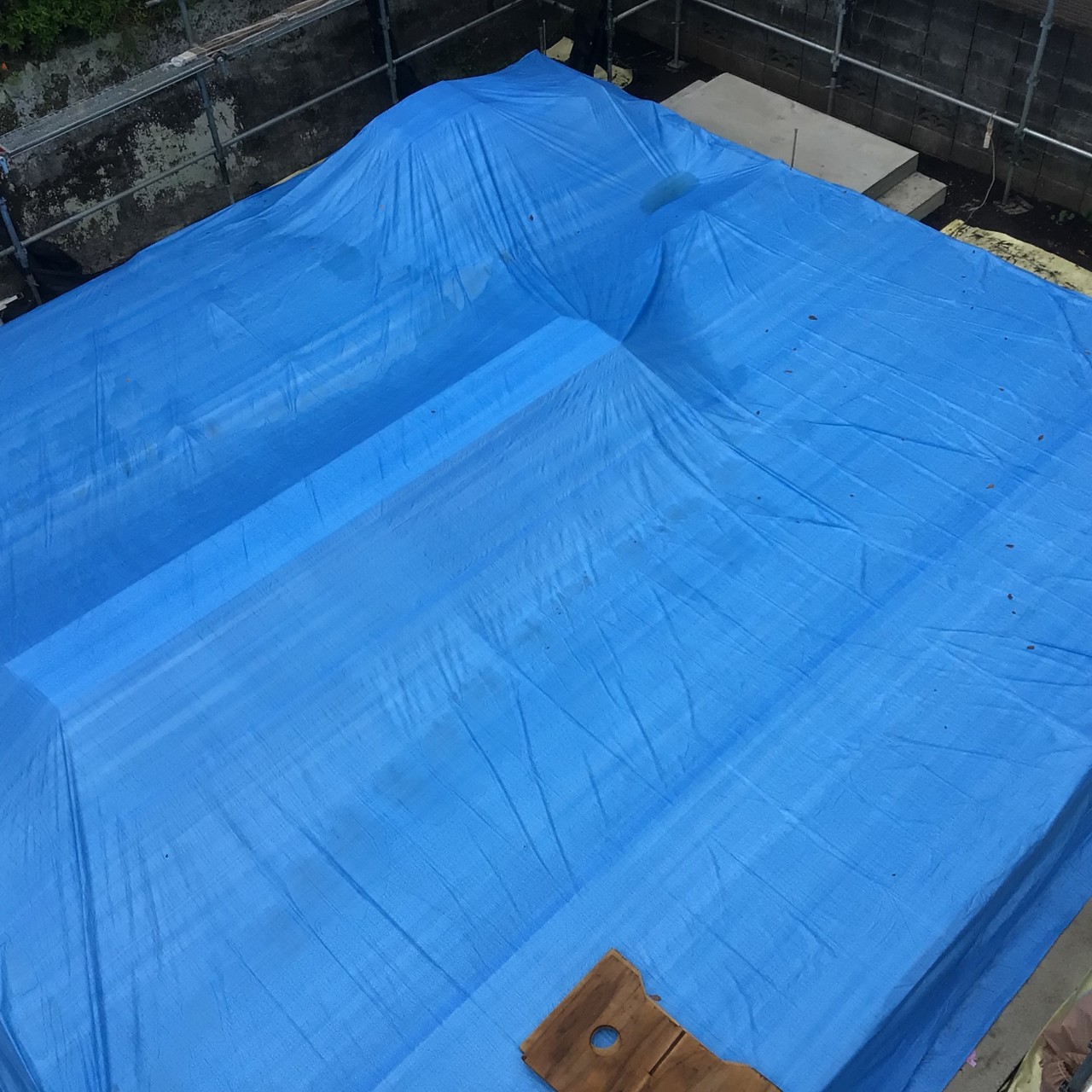 木曜日が雨だったので、ここからブルーシートを全体に掛けて上棟を待ちます。