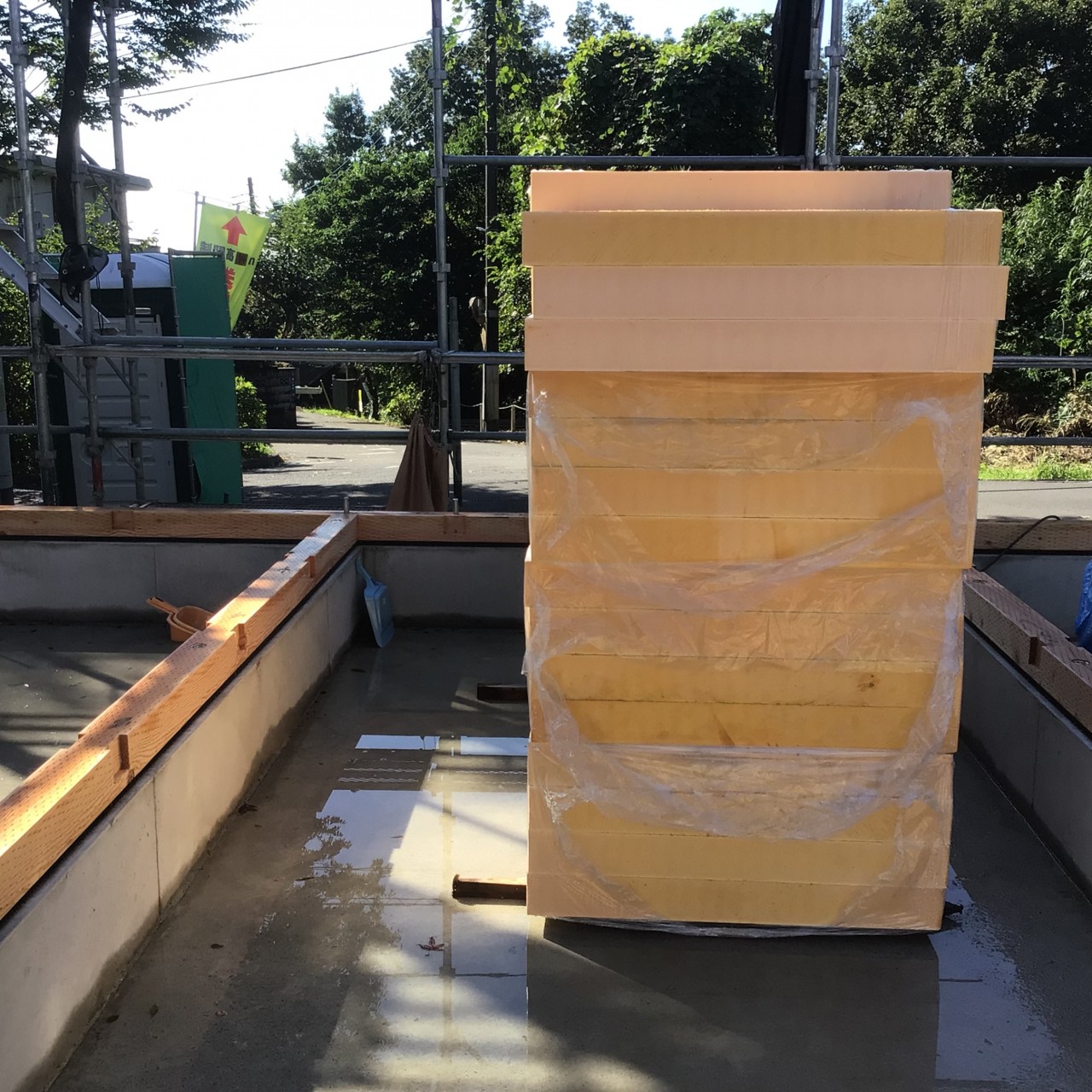 基礎の内側と外周部から1mの範囲で断熱材を敷いています。