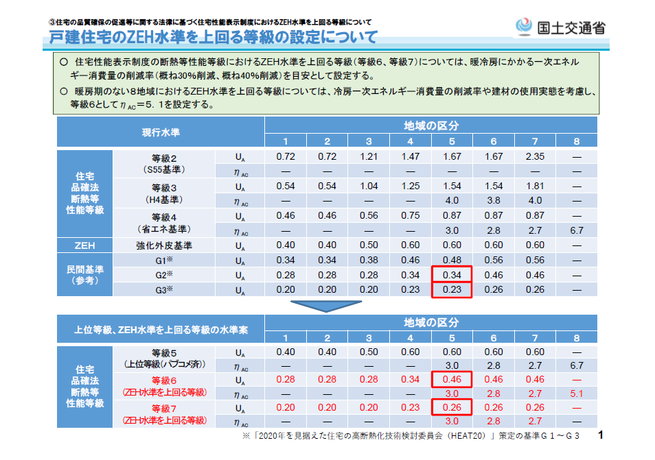 この国土交通省の資料を見ると民間基準のHEAT20G2、G3程度の性能が品確法に設定されるようです。