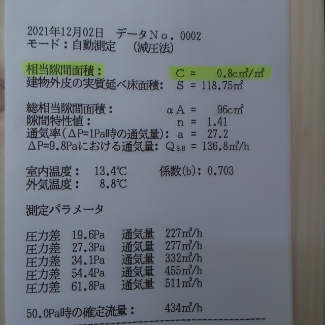 最近の気密測定では弊社の工事レベルもあがり、1回目の測定で1以下になってきました。