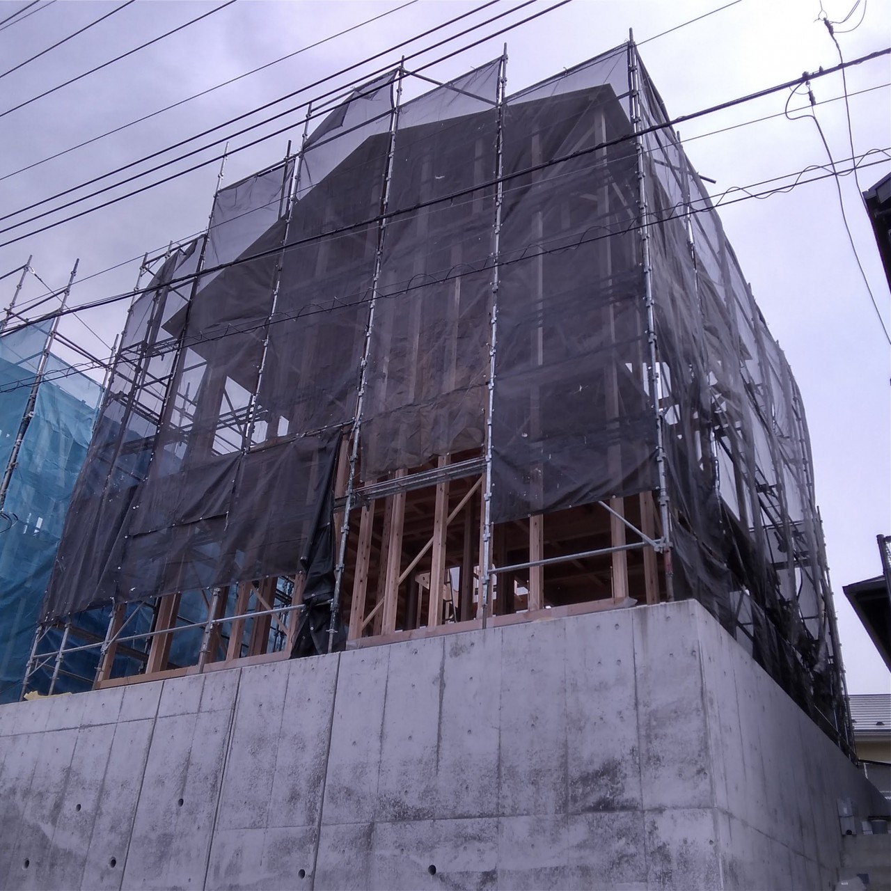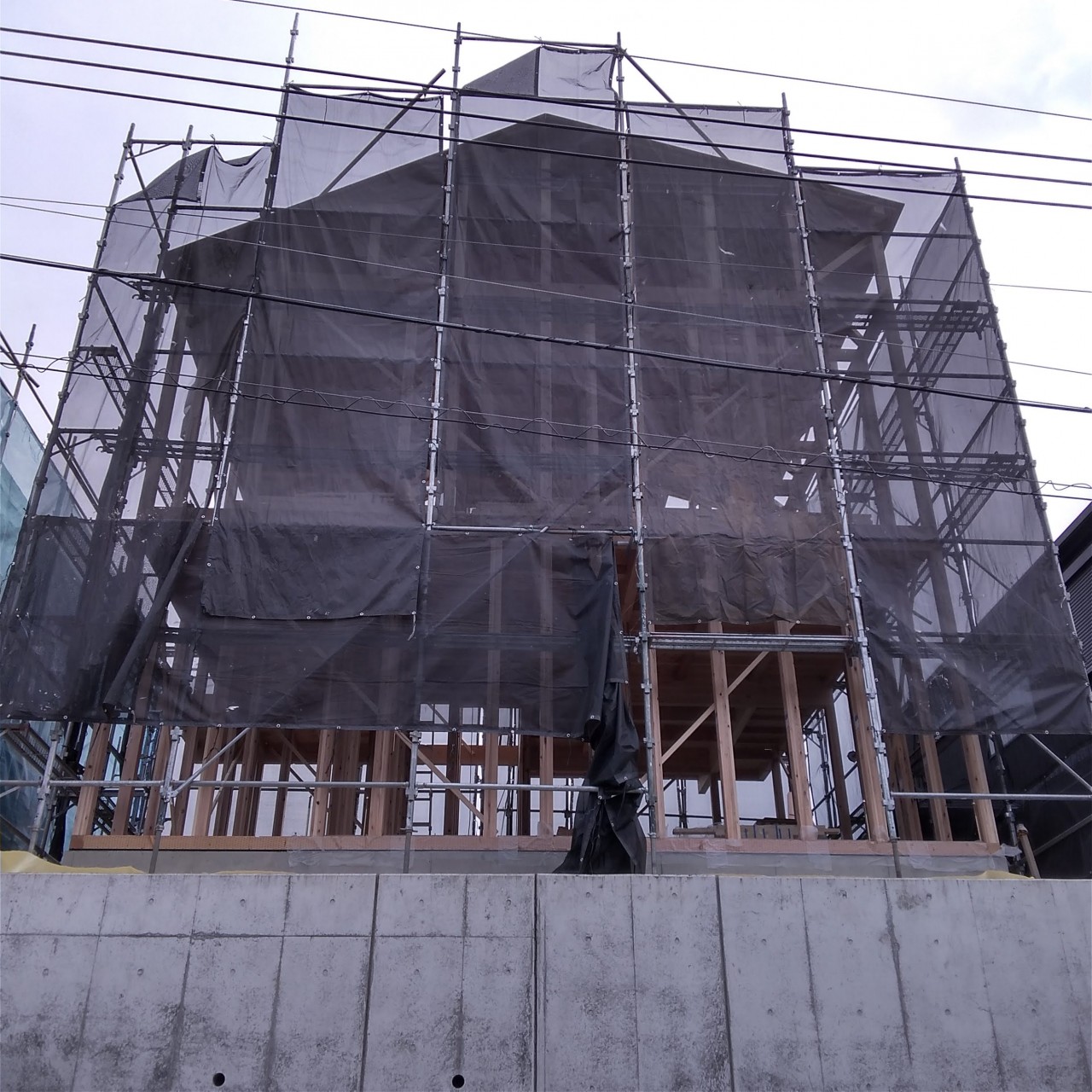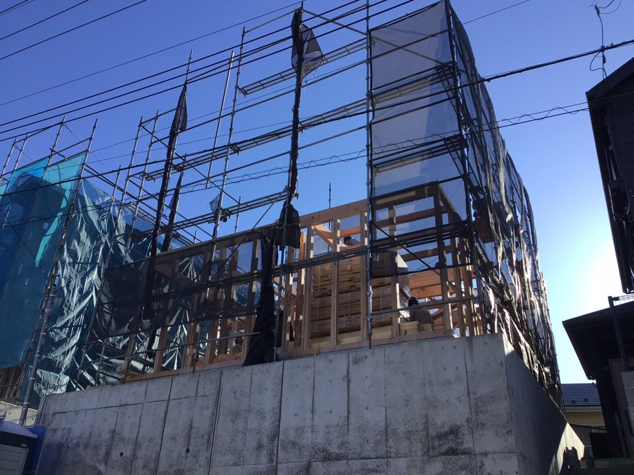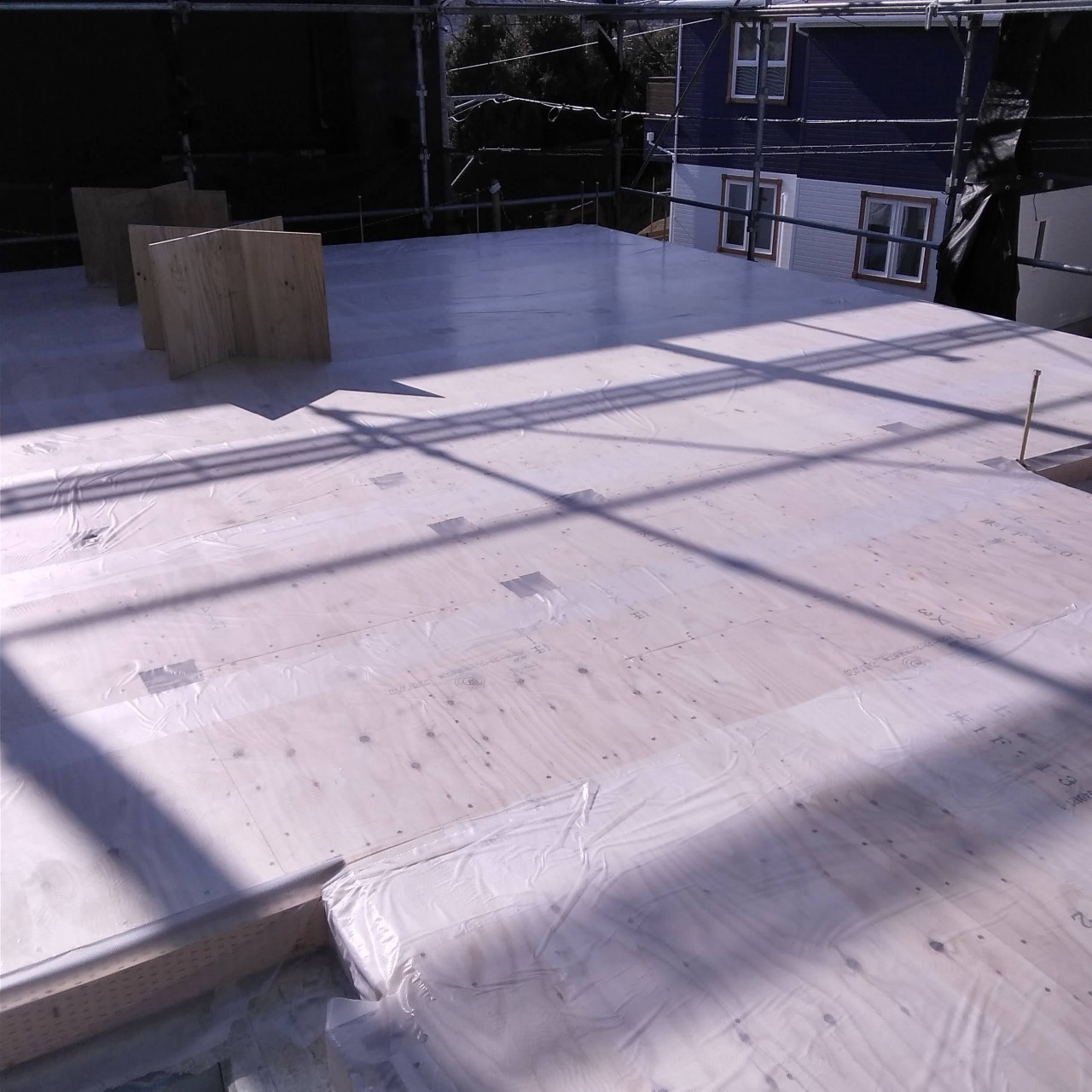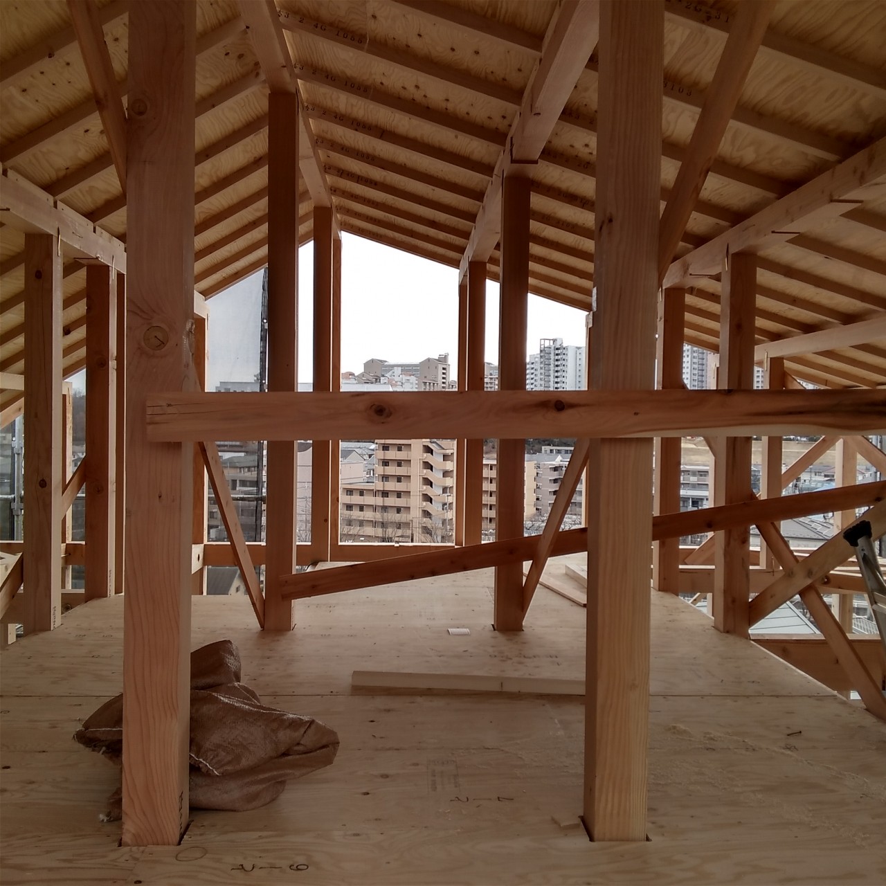 1階の柱を建てて、2階に敷きこむ厚床合板を搬入しています。