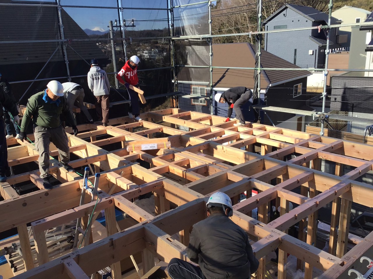 9時頃には2階の床の梁組が出来上がりました。