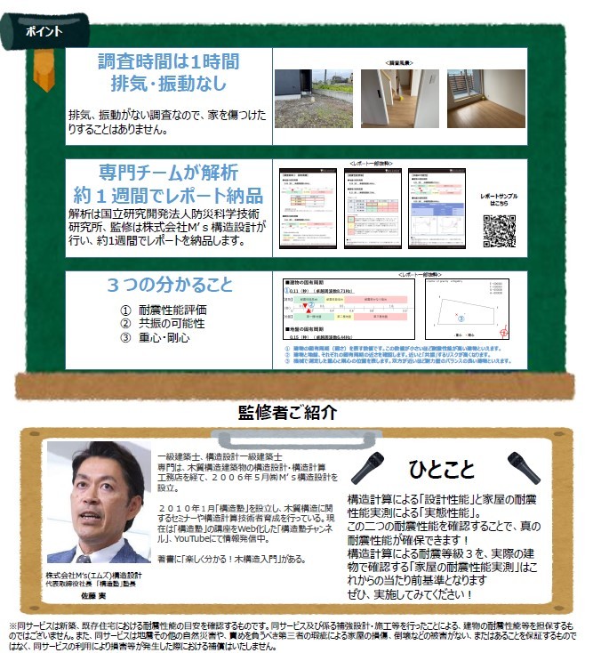 この微動探査ですが、新築だけでなく、リフォームで現在の住宅の耐震状況を調べる事が出来ます。
