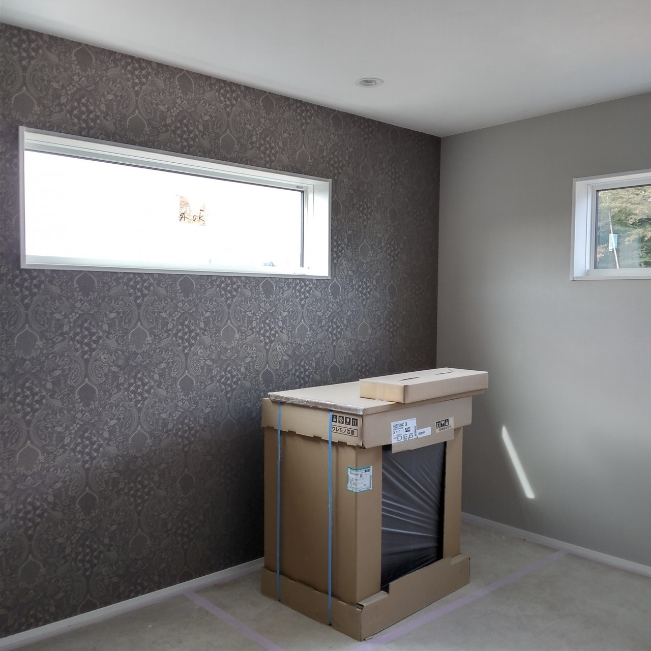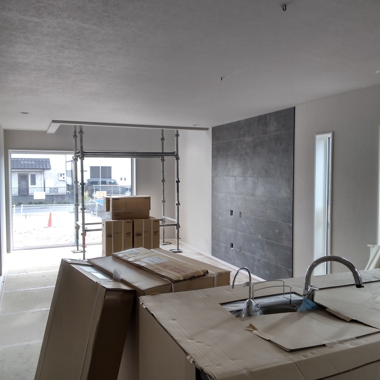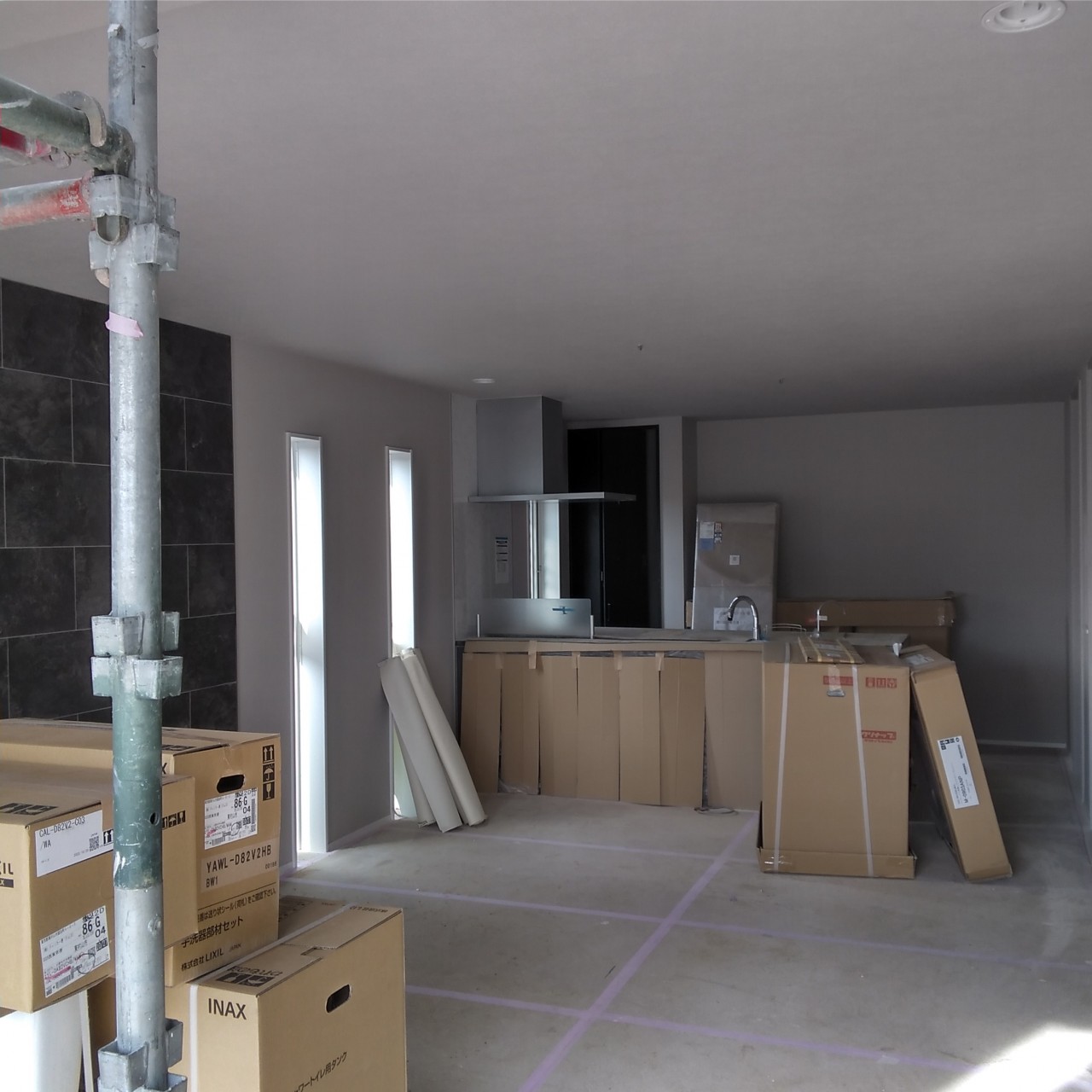 現在、現場は完成に向けて、クロス工事が完了し、設備工事、清掃、カーテン工事、外構工事と進んで行く予定です。