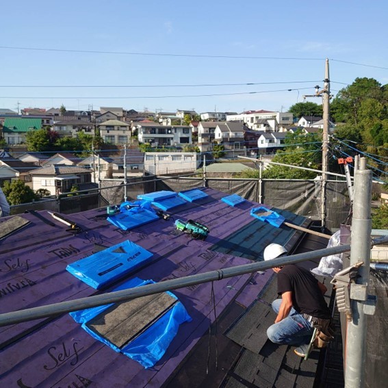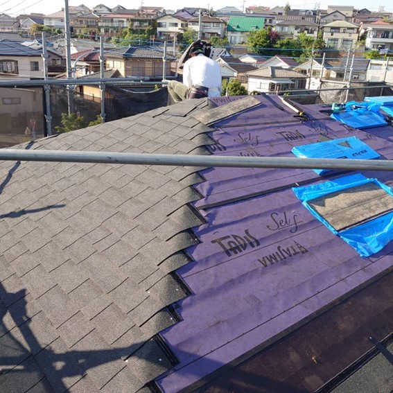 既存の屋根の上から紫のシートである、通称「ルーフィング材」を施工し、