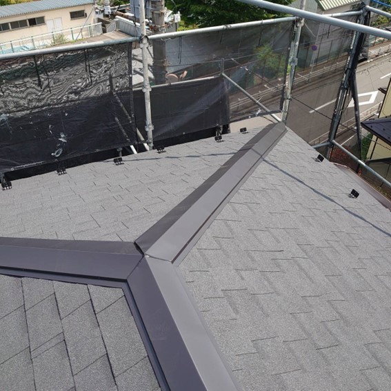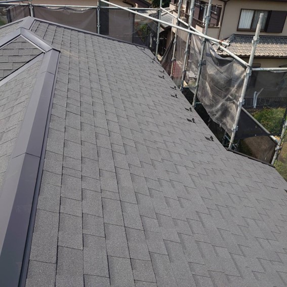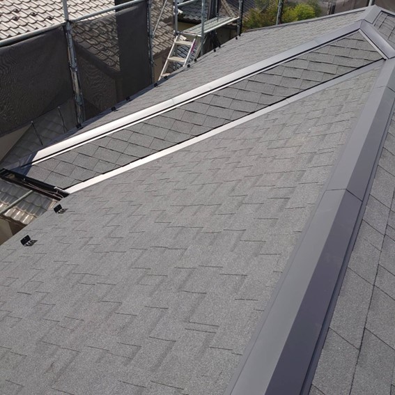 仕上げの屋根材はアスファルトシングル材という、軽い屋根材を施工しました。