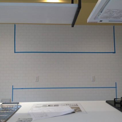 青いテープが設置される食器棚のイメージとして、貼りました。