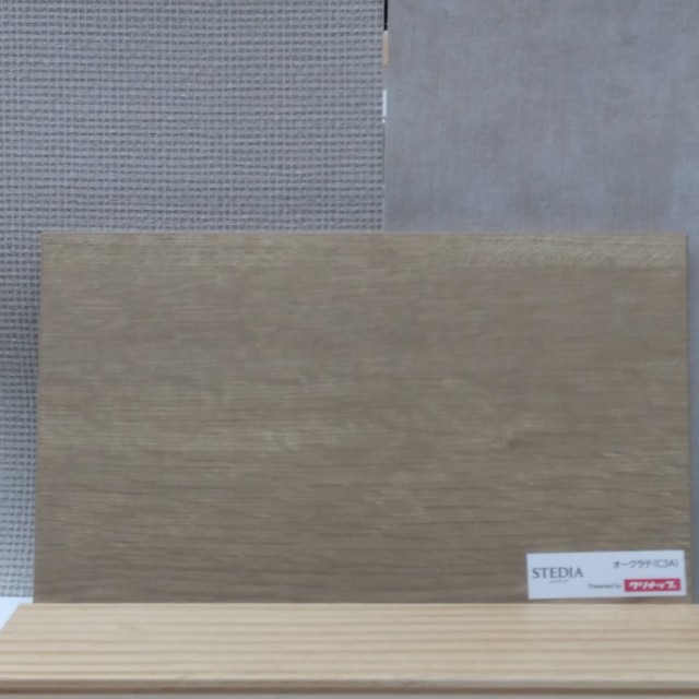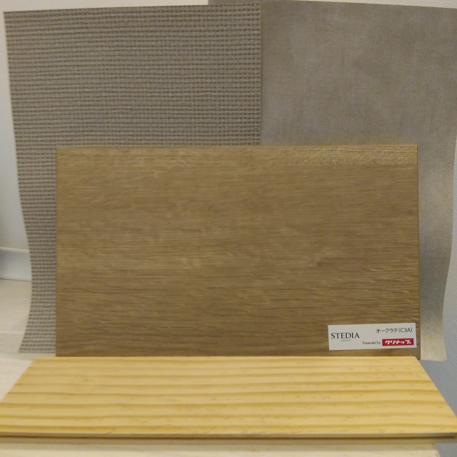 只今はキッチンのカップボード側に少しアクセントをいれようかなと、写真のように床やキッチン扉のサンプルと色合わせをしてみています。