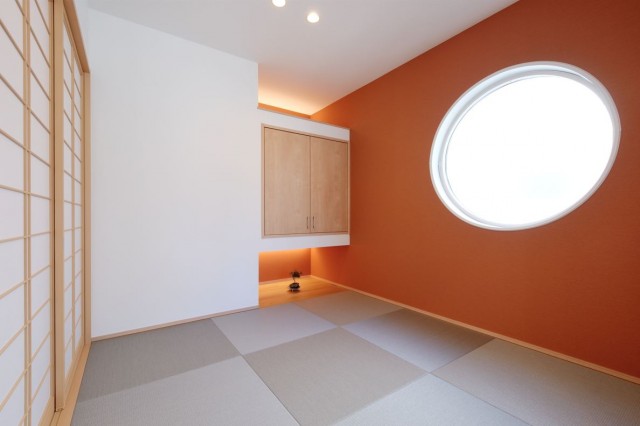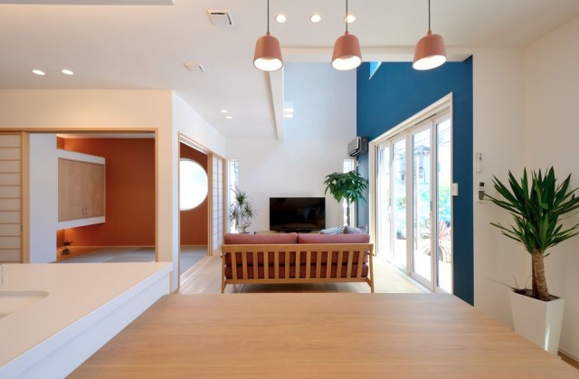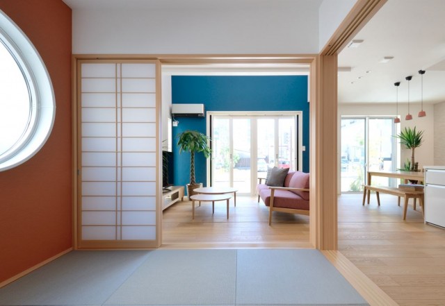 空間的にアクセントのカラーも和室とリビング側で対比をつけてもよさそうだな、と思いましたので、思い切って補色(いわゆる反対色)の色関係をチョイスしてみました。