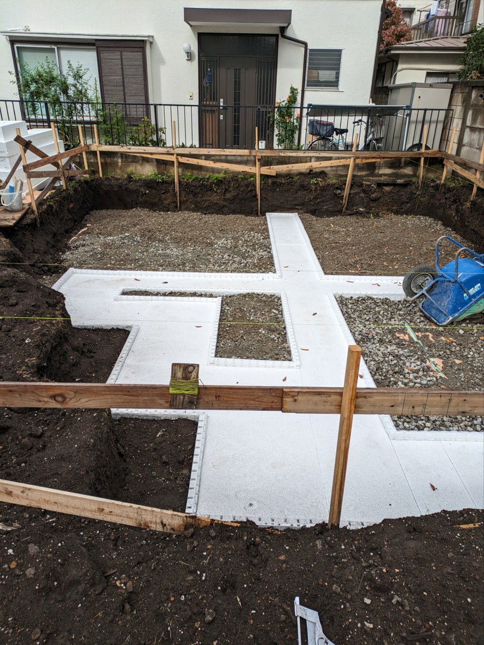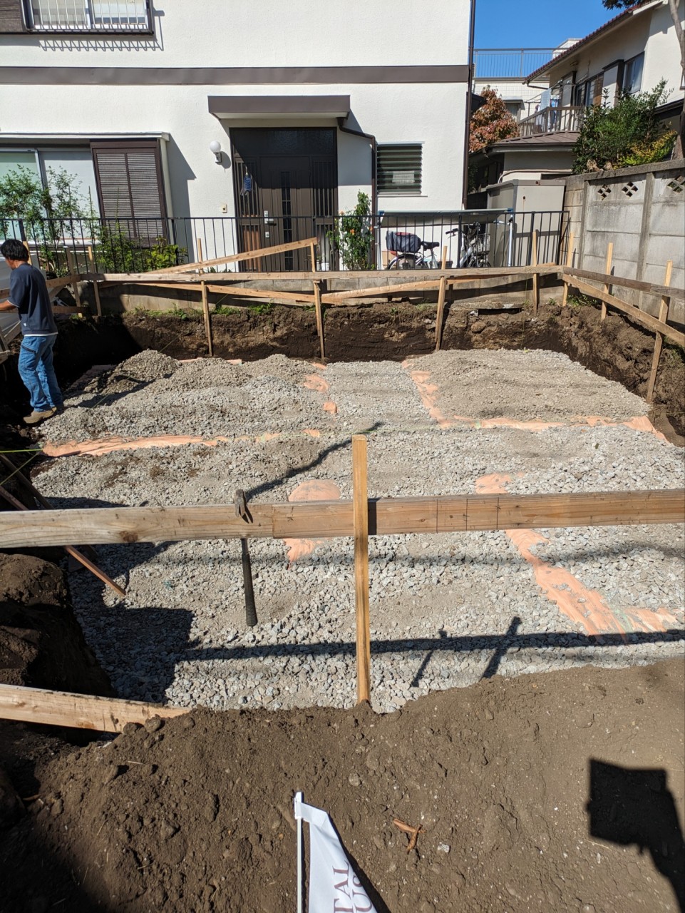 根切り・砕石工事中。建物下の土を出し砕石で転圧します。