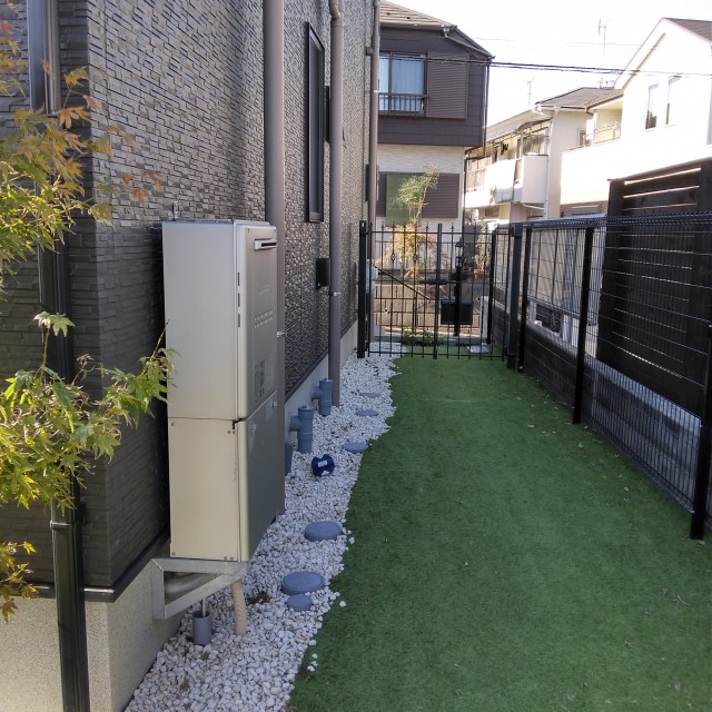 お引っ越し後におうちの裏側のお庭スペースでワンちゃんが遊べるように、と門扉設置の工事をご依頼いただき、弊社で工事をしました。