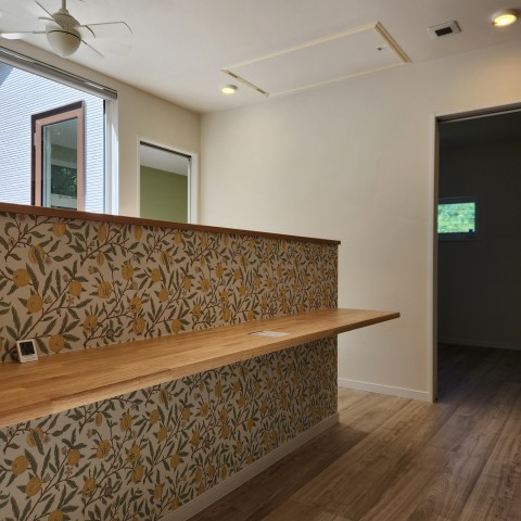 余談ですが、ウィリアムモリスの柄のクロスは弊社の八王子市中山の分譲型モデルハウスの一部に貼っています。気になる方はぜひご見学にいらしてください。 下の写真は中山の2Fの回廊にあるスタディー&ワークスペースのカウンターです。こちらはサンゲツさんのクロスでフルーツという柄です。