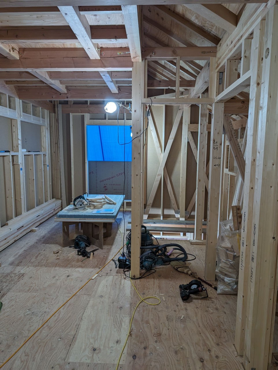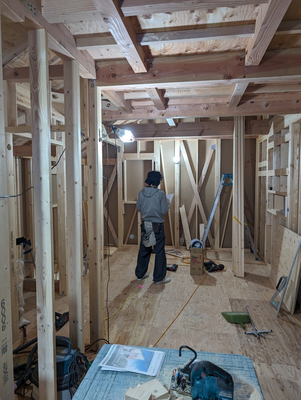 1週間もすると壁合板や窓回りの下地などが貼られておりました。
