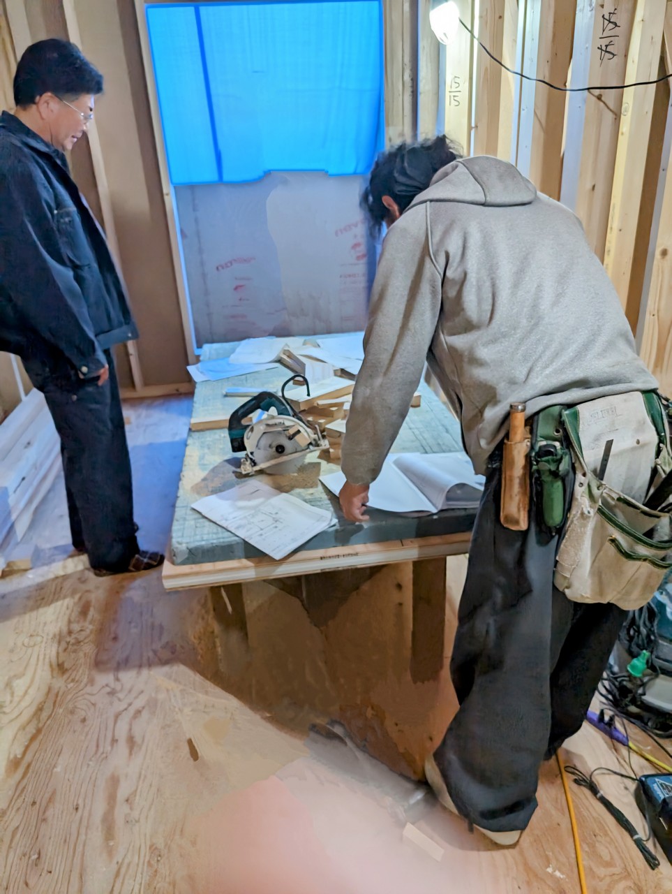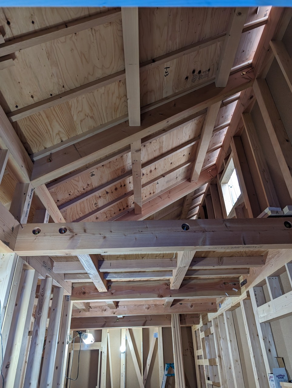今日は、先日上棟した現場で大工さんと打ち合わせをしました。